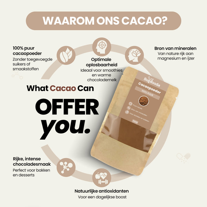 - 100% puur en onbewerkt: Geen alkaliverwerking (niet-Dutch processed), zodat alle natuurlijke voedingsstoffen behouden blijven