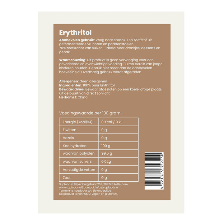 Op zoek naar een natuurlijke zoetstof zonder calorieën? Erythritol is jouw perfecte partner voor een zoete smaak zonder spijt. Deze 100% pure zoetstof, gewonnen uit gefermenteerde natuurlijke bronnen, geeft je drankjes, desserts en gebak de perfecte zoetheid, maar dan beter. Vegan, non-GMO en glutenvrij. Eenvoudig zoeten, puur genieten.