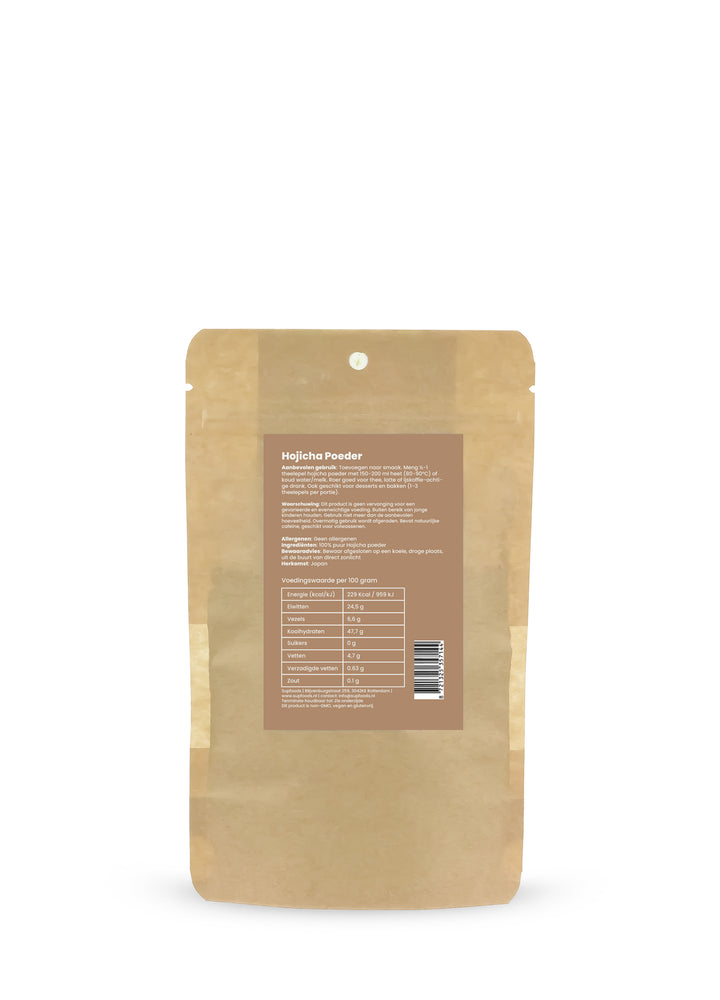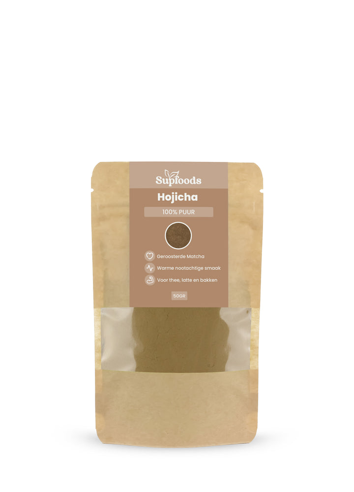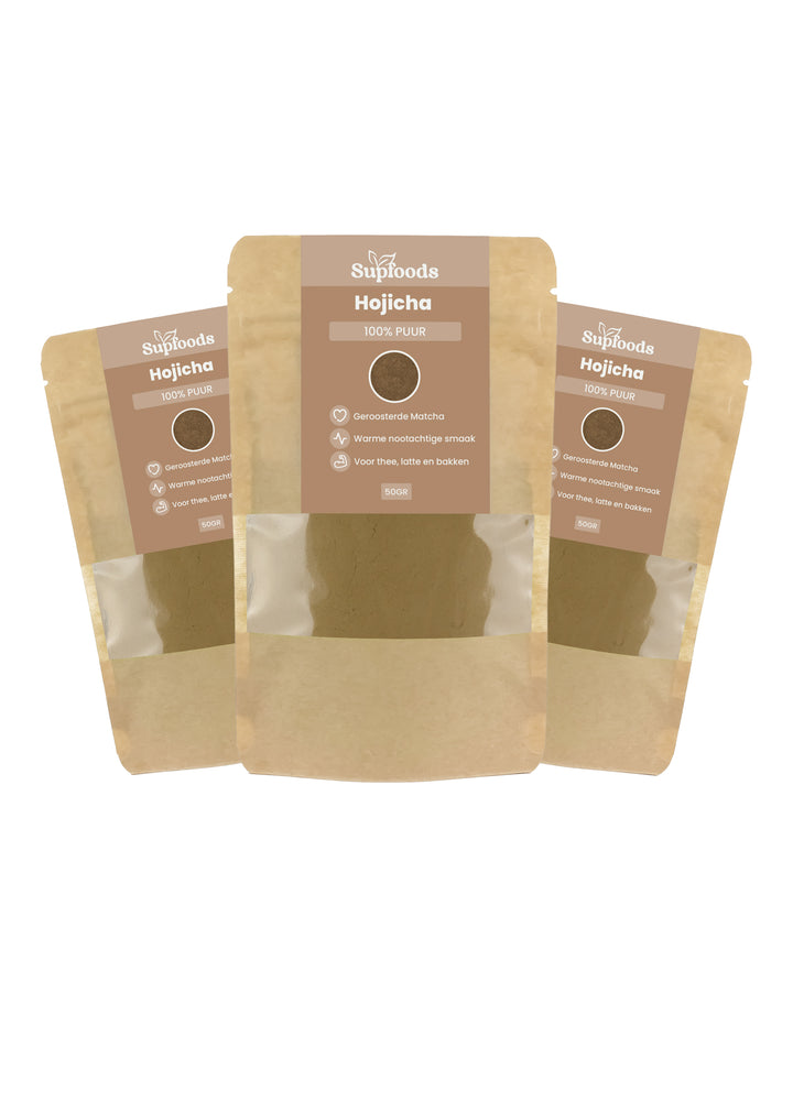 Hojicha is een traditionele Japanse thee gemaakt door groene theebladeren te roosteren, wat zorgt voor een diepbruine kleur en een uniek, lichtzoet aroma. In poedervorm behoudt het alle voordelen van groene thee, maar met een milder en toegankelijker profiel dan matcha.
